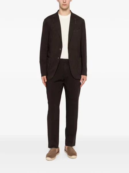 Na hnědé bývá vidět prach, mastnější skvrny i mapy po dešti, zvlášť u světlejších odstínů. Po nošení oblek vyvěste, přejeďte ho měkkým kartáčem a nenechte nečistoty zaschnout. Lokální skvrny od kávy nebo vína řešte co nejdřív navlhčeným hadříkem, bez drhnutí.